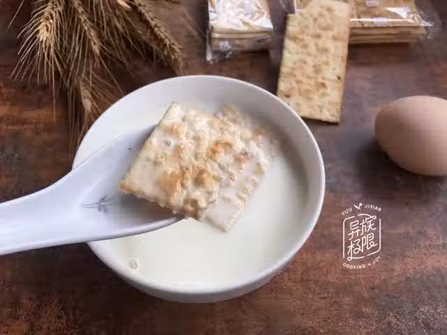 蘇打餅乾遇到熱牛奶後表面吸取牛奶膨脹,形成很多小氣泡,裡層依然是酥脆的,這時口感最佳,吃在嘴裡,先感觸到一層奶汁滋潤之口腔,當上下牙扣到餅乾內層又是脆的,嚼起來噠噠響。唇齒間歡快的跳動起來,如喜歡甜味,牛奶里加入白糖,蘇打餅乾的口感更奇妙。