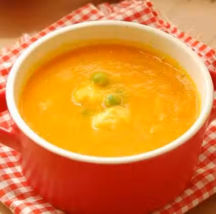 2南瓜蒸熟去皮,加適量水,放料理機里打成細膩的糊;南瓜糊倒入鍋內燒開後,加入焯過水的豌豆並加鹽和糖調味(我家的這個南瓜不太甜,所以我另外加了些糖,請根據實際口味調味)。