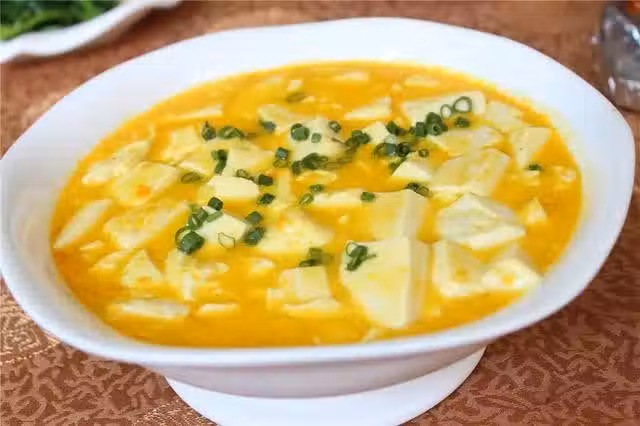 用料:內酯豆腐一盒,鹹鴨蛋黃兩個,蔥花少許,玉米澱粉少許,雞精少許