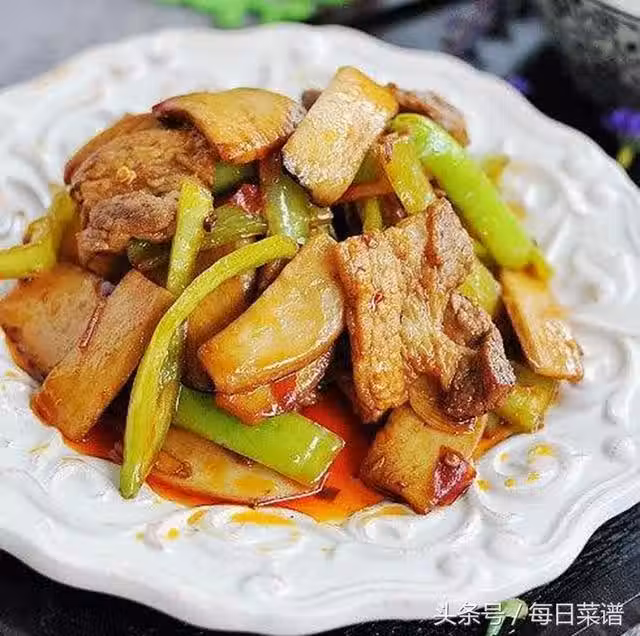 1、杏鮑菇切片、蔥姜切絲、蒜切片。瘦肉切薄片、青椒切片。
