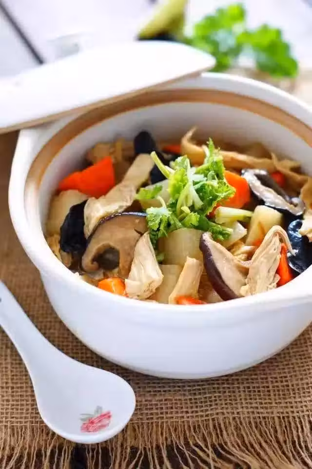 1. 腐竹、木耳、香菇提前用清水泡發,洗凈擠干水分;白蘿蔔洗凈切約1.5厘米見方的塊、胡蘿蔔切小塊,腐竹切小塊,木耳撕成小朵,香菇切片。