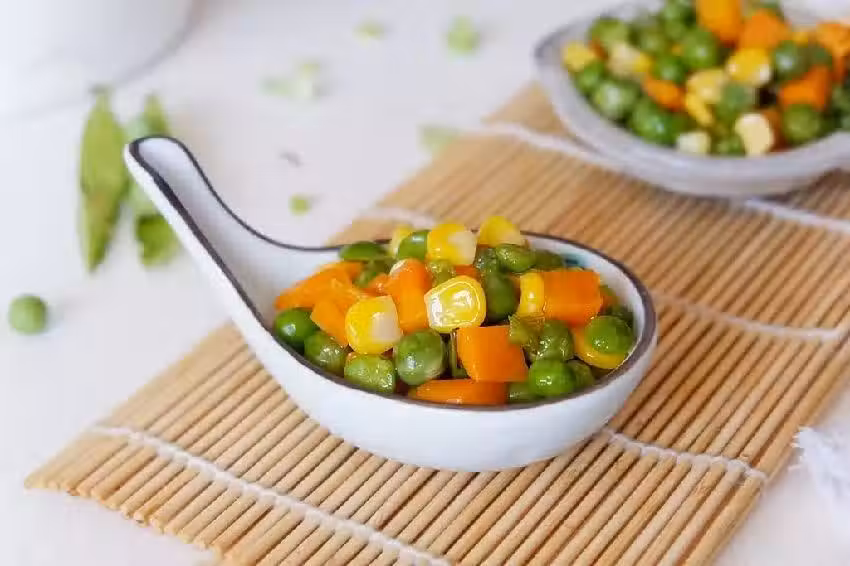 甜玉米粒(熟)60克,豌豆(熟)50克,胡蘿蔔60克,食鹽1/2勺,橄欖油20毫升