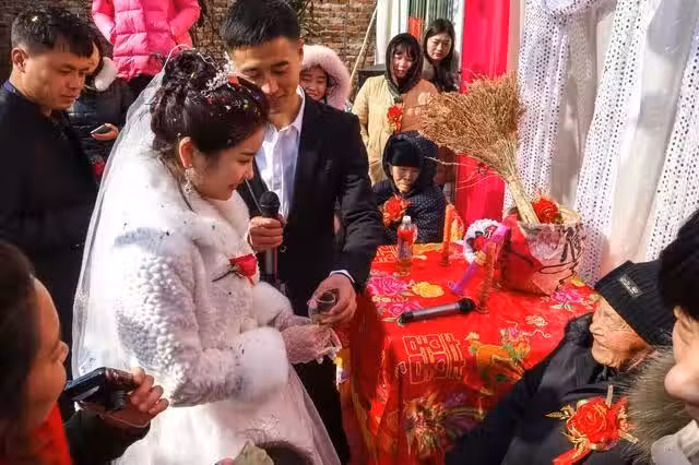 當年說喊他吃飯總被別人搶先的爺爺如今還健在,身體還算硬朗,那五百塊錢(約2300台幣)就是他送的。他拉著阿五的手:「你結婚爺爺高興啊,這錢是爺爺給你的,要拿著!」