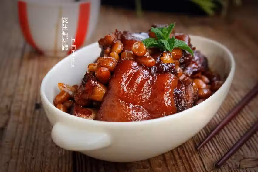 花生燉豬蹄,以豬蹄和花生仁同燉,是比較滋補的一道菜品。可做成燉湯類,也可做成咸鮮可口的下飯菜。還被經常用來作為孕婦早期的食譜。
