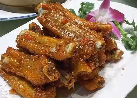 4、排骨裹上蛋糊,放入五成熱的油中炸酥,撈起濾干油。