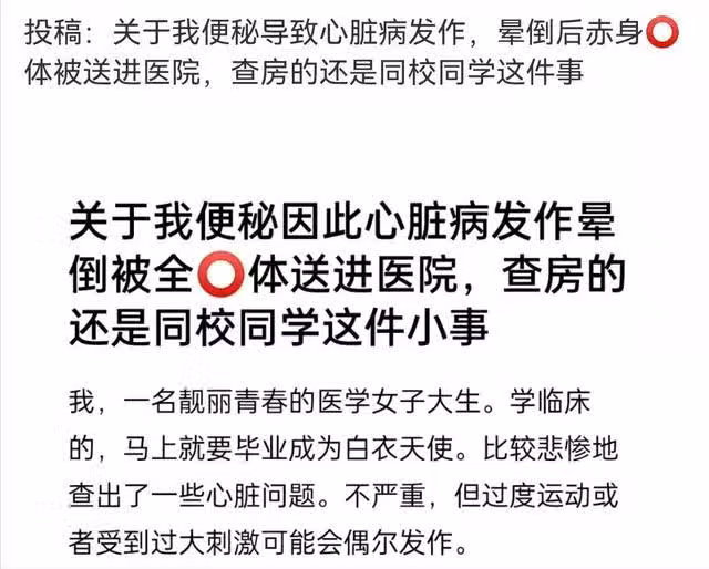 因便秘導致心臟病發作暈倒,當時沒穿衣服,也沒擦沒沖的她,就這樣被救護車送到了醫院,查房的還是她的同校同學……