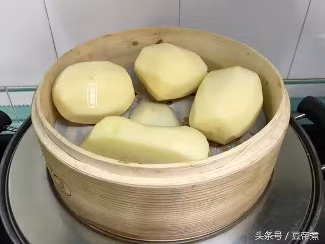 2、土豆去皮後立刻泡入水中,清洗乾淨後上鍋蒸熟。出鍋後趁熱立即搗爛