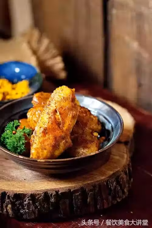1、雞翅中洗凈,兩面分別斜劃兩刀,加入咖喱粉、料酒、鹽拌勻,腌制2小時以上至入味。