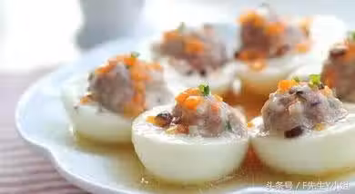 2、雙手蘸少許水,將肉餡做成丸子,釀入雞蛋白內。放入蒸鍋中蒸至肉餡熟嫩後端出。