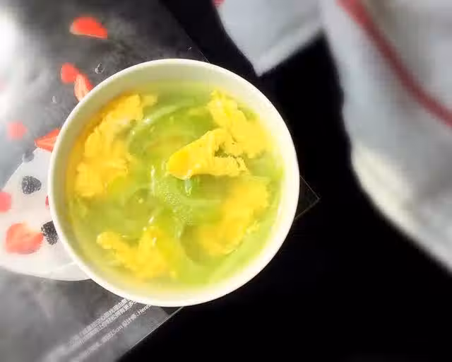 鍋里重新加入適量清水,燒開後加入苦瓜,把雞蛋打散,再次燒開後加入雞蛋液,待蛋花成型後關火,加入適量鹽和香油調味即可!