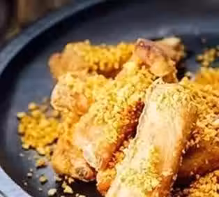 香蔥切段,老薑切絲。排骨剁快,洗凈控干。加入生抽、料酒、白砂糖、白鬍椒粉、蔥段、薑絲抓拌均勻,腌漬30分鐘。大蒜去皮後切成粗粗的碎粒。炒鍋中注入油,中火加熱至四成熱時,放入蒜碎調成小火,炸至蒜碎呈金黃色,撈出控干。炒鍋中的蒜油,繼續用中火加熱四成熱時,把腌漬好的排骨,蘸上一層干澱粉,放入油中炸至金黃撈出控干。炒鍋中留少許底油,把金蒜碎和排骨放回鍋中,用中火加熱,翻炒均勻即可上桌。