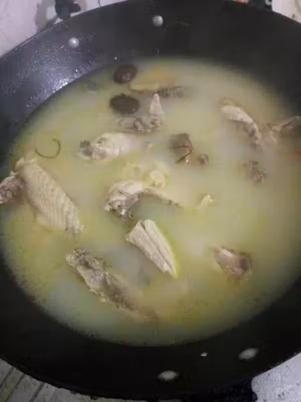 鐵鍋裡加滿水,待沸騰將雞塊推入,等待一會兒,水再次沸騰時,將雞塊撈出,洗淨雞身的浮沫和油。