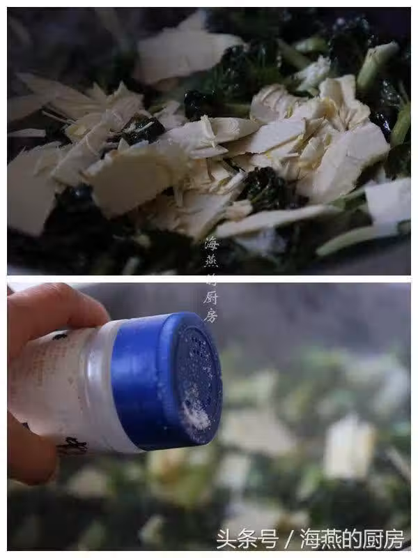 接著調入少許食鹽,翻炒均勻後燜蓋3-5分鐘