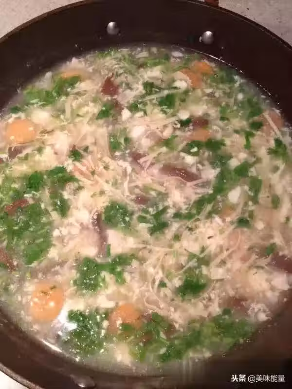 鍋內放一鍋冷水,倒入嫩豆腐,鴨血,百葉絲,豆渣餅,中火燒開。將1個雞蛋打散,舉高手臂快速倒入湯中,構成蛋花,再加適量的鹽調味。最終,生粉加冷水混合,倒入鍋中攪勻,出鍋前再灑入香菜末,即成。