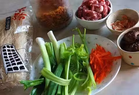 米粉1包 300g,豬肉絲 200g,芹菜 3支,蒜苗 2支,香菇(小) 10朵,蝦米 1大匙,油蔥酥 適量,白鬍椒 適量,鹽 適量,雞高湯 適量。