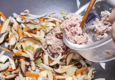 如果不會翻鍋拌炒,也可以用筷子在鍋中「畫圓」將食材充分拌勻。