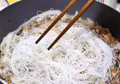 用筷子炒米粉能輕鬆將米粉撥散,若用鍋鏟反而不上手。建議用一般長度的木筷,拌炒時手就能感受到鍋中溫度是否太高來調整火候。