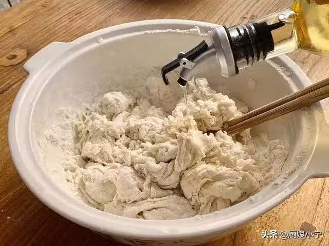先加水攪成面絮,攪拌到沒有乾麵粉然後加入食用油。