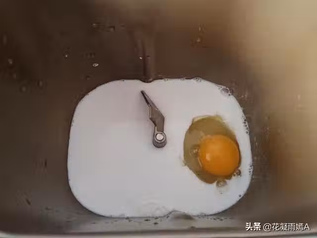1、先把牛奶、雞蛋、白糖、鹽倒入麵包機桶內。