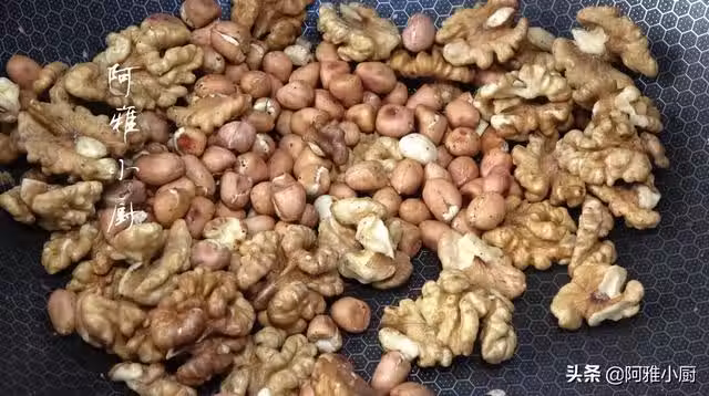 4.把花生和核桃仁放到破壁機中打碎,用鏟子翻動一下,再加入黑芝麻打,中間再翻拌幾下,這樣打的更細膩。