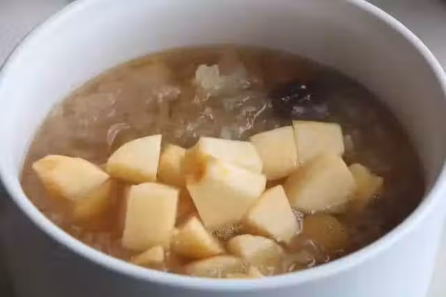 7、出鍋之前撒適量的枸杞,這樣香甜軟糯的銀耳蘋果糖水就好了;