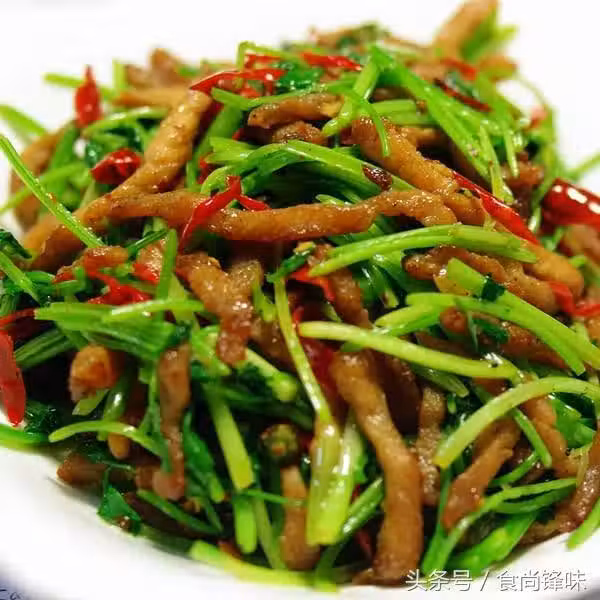 4、爆香蒜末,辣椒段。翻炒肉絲,分次調入少量料酒。