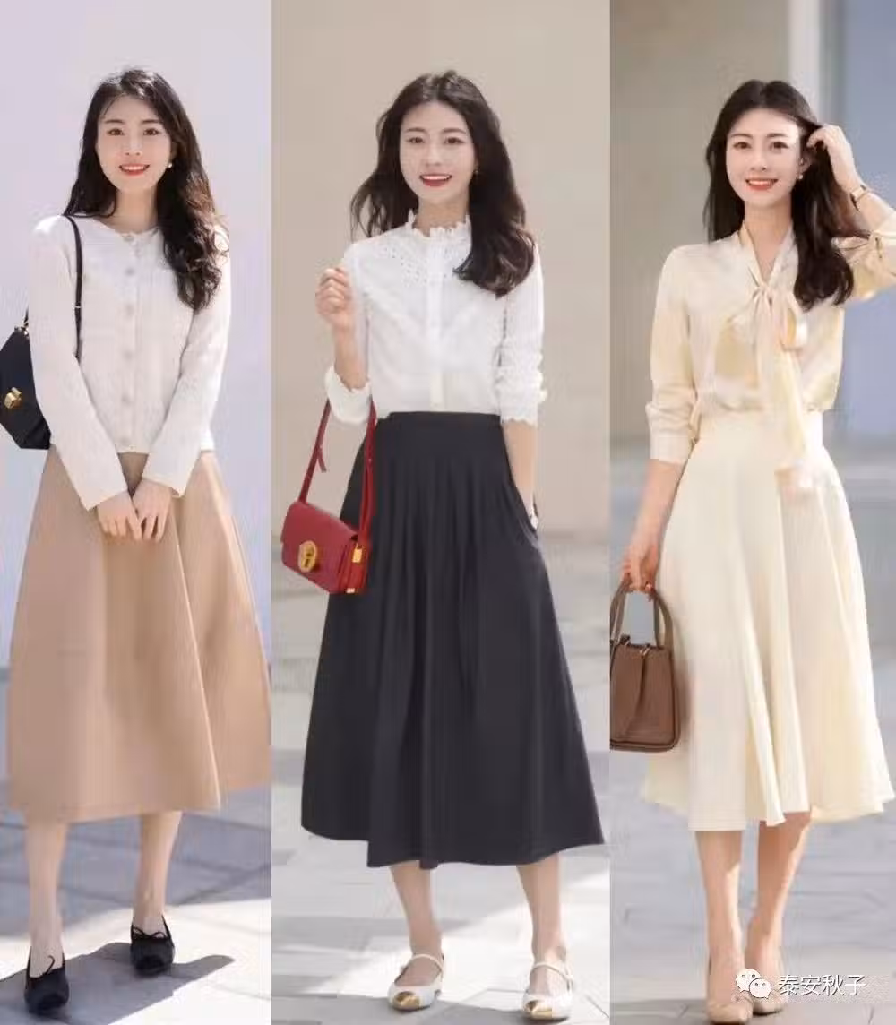 在搭配半身裙的時候,可以選擇帶有設計感如飄帶領襯衫,蕾絲拼接……的上衣與之搭配,營造出「繁簡結合」的時髦感。