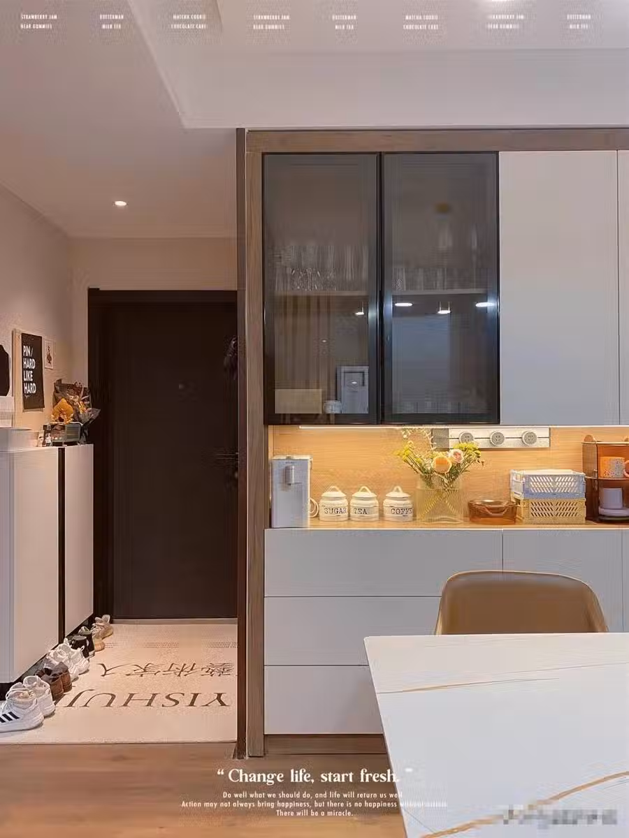 餐廳是沿著玄關走廊進來後再左轉的第一個空間,裝修上,這里直接擺放白色紋理的巖板餐桌,再搭配六人位的簡約餐椅就可以了。另外,黃銅質感的吊燈看著也蠻精緻的。至於硬裝延續了客廳的風格,基於此這里就不多講了。