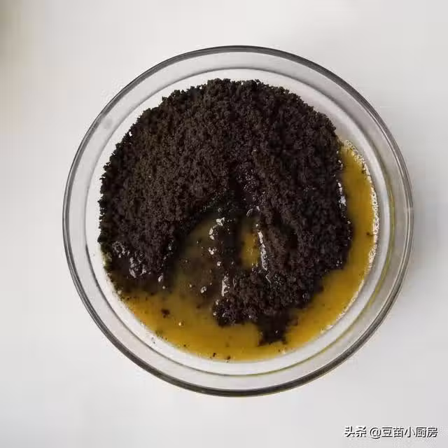 餅乾去掉夾心之後,裝入保鮮袋,用擀麵杖壓碎,放在一個空碗里,倒入隔水加熱後融化的黃油。加入黃油是為了增加餅乾碎的黏性,沒有黃油可以用其他沒有味道的植物油代替。