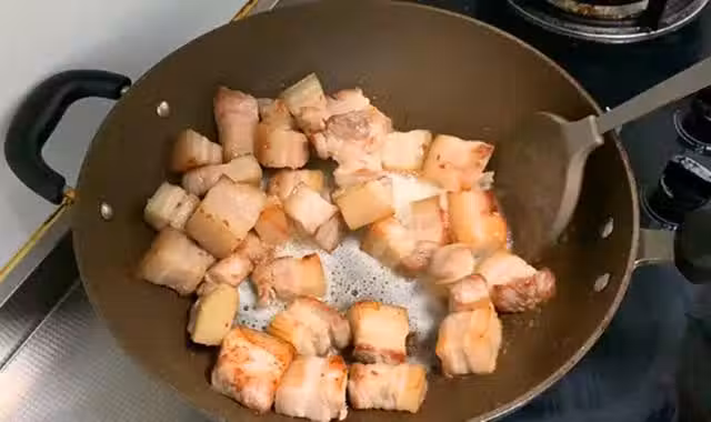第三步:這也是紅燒肉香而不膩非常關鍵的一步,起鍋加少量油,把五花肉倒入鍋中煸炒出油,肉中的油被煸出來,吃起來自然就不油膩了,炒出來的油直接倒掉。很多人都會少了這一步,難怪吃幾塊兒就油的發膩。