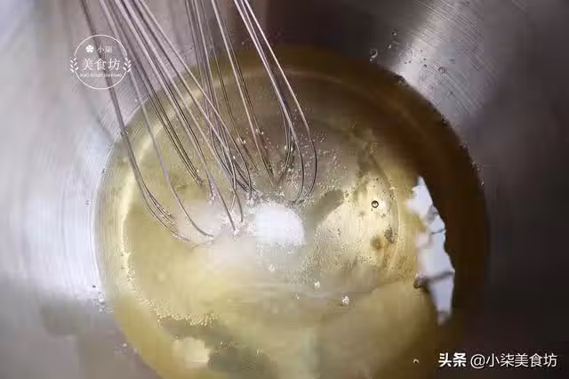 第六步:打發至白色糊狀,把剩餘的糖加進來繼續攪拌。蛋白糊會變細膩光滑狀,我喜歡打到小尖角拉絲的狀態。這次打得偏軟一點,成品組織細膩。再打幹一點點也可以的。