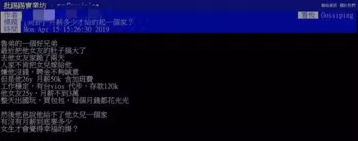 然而女方爸爸卻認為原PO朋友沒誠意沒錢,給不了他女兒一個家,讓原PO忍不住好奇問「有沒有月薪到底要多少,女生才會覺得幸福的卦?」