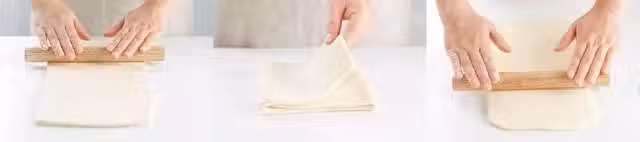 5、取出冰箱中的麵皮,分別在操作台和麵皮上都撒上少許手粉,用擀麵杖把麵皮向四邊擀開,形成一張寬度是高度的兩倍左右,厚0.5cm左右的長方形麵皮;用毛刷刷掉多餘手粉,把這張麵皮沿著長的一邊折三折,包好保鮮膜放入冰箱冷藏20分鐘;再次取出麵皮,在操作台和麵皮上分別撒少許手粉,然後用擀麵杖均勻地擀壓麵皮,擀成長度是寬度3倍,厚0.5cm的長方形麵皮;