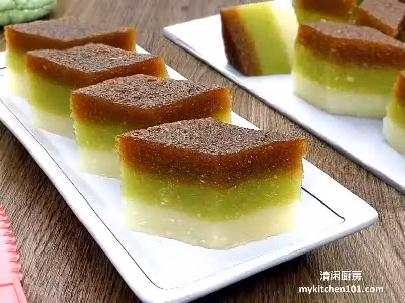無蛋版蒸三色木薯糕,底層是原味,中間青色層是香蘭口味,上層褐色層則是黑糖口味。