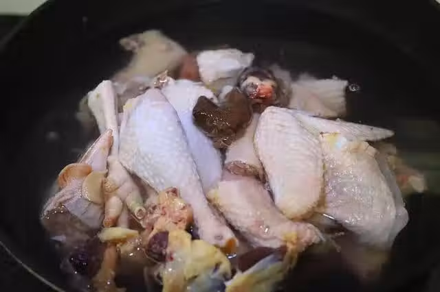 4、將準備好的煮鍋中加入涼水,然後將切好的土雞塊放入盆中進行浸泡,將雞塊中的血水洗乾淨。現在需要將準備好的雞塊倒入鍋中,然後將準備好的料酒,生薑放入鍋中,加大火進行煮開,數分鐘後鍋中的水開了,這時候就可以關火了,這時候鍋中會有好多雞肉的血水和臟物,把它們過濾出去就可以了。