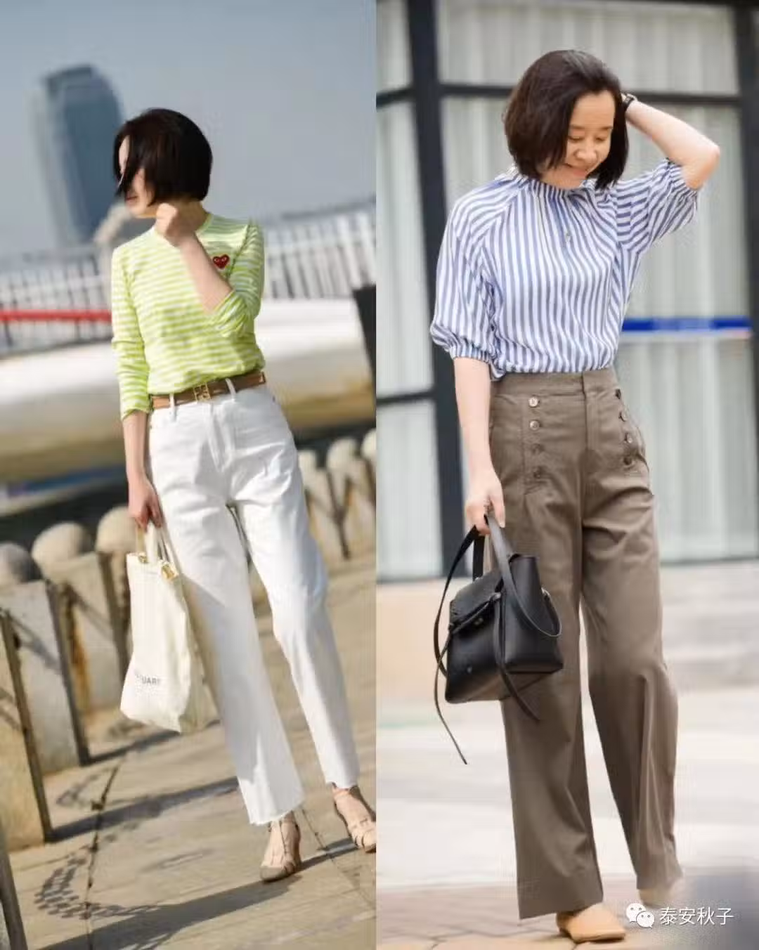 左圖中的博主,穿了一條質地透氣的高腰直筒褲,搭配淺綠色條紋針織衫,腰間利用了棕色皮質腰帶,勾勒出了高挑的腰線位置,醒目又時髦。