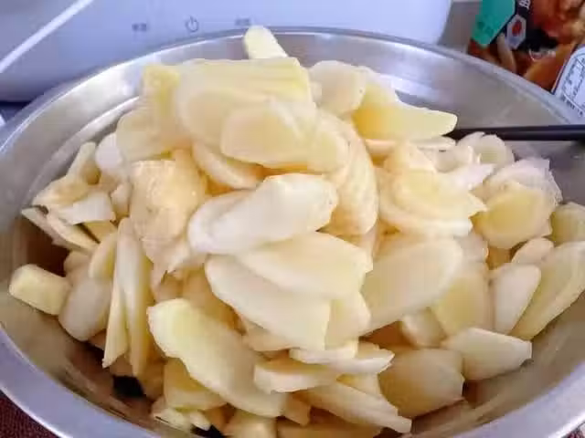 1、將新鮮姜塊洗凈,並用刀颳去外皮。可以選擇將姜切成薄片或細絲,根據個人喜好來決定,一次可以多做一些,能吃一整個夏天。