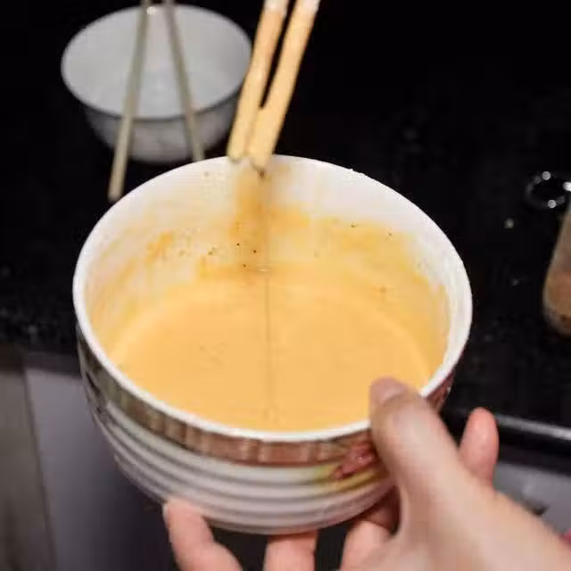 將雞蛋清用筷子順一個方向攪打,打至起泡,筷子在蛋清中直立不倒為止。然後加入乾澱粉拌和成糊。用它掛糊製作的菜看,外觀形態飽滿,口感外松裡嫩。