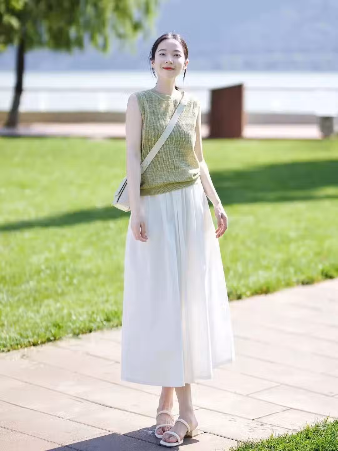 白色上衣+綠色下裝,是夏日清爽又涼快的穿搭。綠色下裝帶來清新感,白色系上衣則更顯清涼。搭配上一款簡約的白色手提包,整體感覺更加高級。