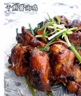 材料:雞半隻(斬塊),青蔥1棵(切段),蒜頭4瓣(切片) 醃料:醬油2大匙,糖1小匙,紹興酒1大匙,麻油1小匙,生粉1茶匙,胡椒粉適量【拌均勻,備用】 汁料:醬油2大匙,黑醬油1小匙,糖1小匙,水3大匙 做法: 1.把切塊的雞肉和醃料拌勻醃製30分鐘。2.燒熱3-4大匙油,放入醃好的雞塊,用中火煎至熟及上色(中途加入蒜片)。3.倒入拌勻的汁料,開火炒至雞肉均勻沾上汁料和幹身,撒入青蔥段拌勻即可。醬油雞