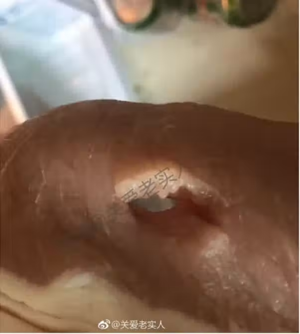 隨後要上夜班的她直到早上下班回到家後,一開冰箱發現家裡的豬肉掉在地上,而且連包裝膜也被拆了,仔細一看發現豬肉上竟然還有一塊洞!