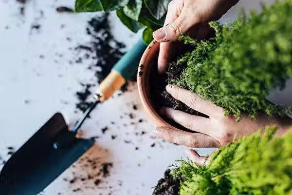 我和老伴拎了袋子,去了小區附近的河邊,挖了一些土回來。老伴搬了小凳子坐在樓梯口,把土和肥料拌一起,然後給花盆鬆土,把肥料填進去。