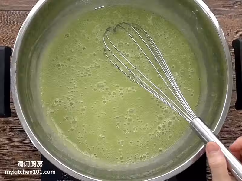 6 再過3分鐘後,椰奶蛋漿已經濃稠了。