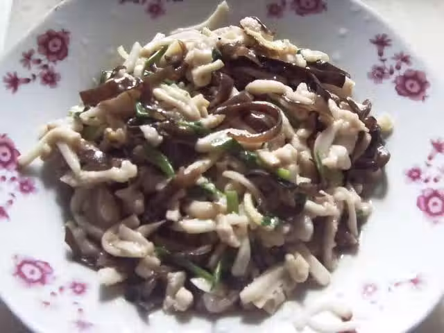放杏鮑菇絲和木耳絲翻炒至熟,加鹽調味