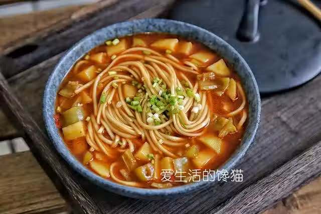 食材:小土豆3個,青椒一根,濕拉麵50克,豆瓣醬2勺,蒜末適量