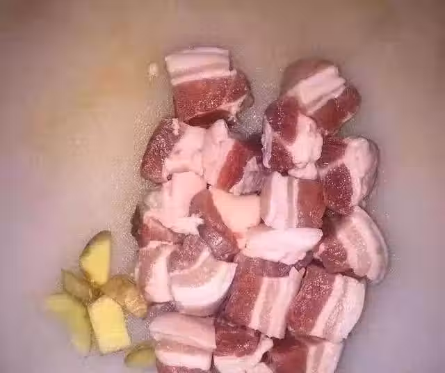 2、然後將切好的紅燒肉放入鍋中,中火,加入蔥段,薑片,蒜塊,辣椒段,香葉等,少量鹽,煮10分鐘左右;因為喜歡軟一點的紅燒肉,所以煮至八九分熟,湯不要倒掉,備用即可;