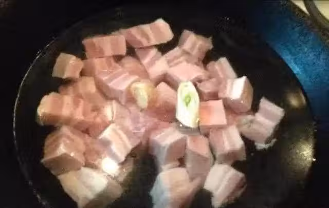3、最關鍵的一部,炒糖色兒:加入適量油,待油燒熱,加兩勺糖,翻炒湯等糖漸漸變為黃色,加入煮好的肉,中火調至大火,翻炒,片刻後再次加入少許蔥,姜,蒜,繼續翻炒;
