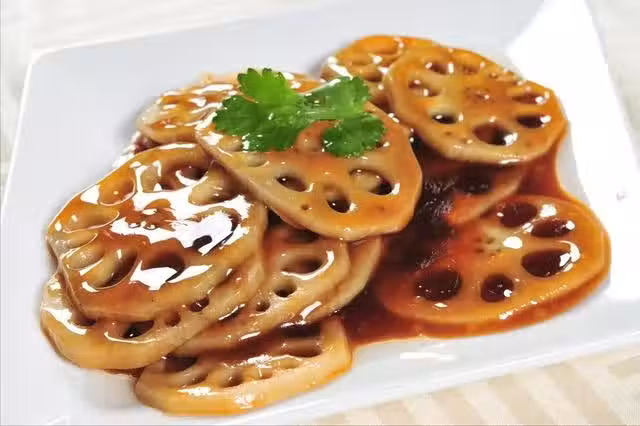 2.炒至藕片熟透,加入適量的糖和米醋,翻炒均勻。生粉加水攪拌均勻後,倒入鍋中,翻炒均勻至汁水變濃稠。出鍋裝盤即可。