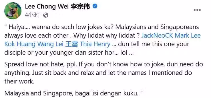 ▲李宗偉社交媒體帳號截圖 6月8日,馬來西亞羽毛球名將李宗偉在社交媒體發文批評喬伊斯林。李宗偉寫道:「為什麼開那麼低級的玩笑?為什麼要這麼做?」