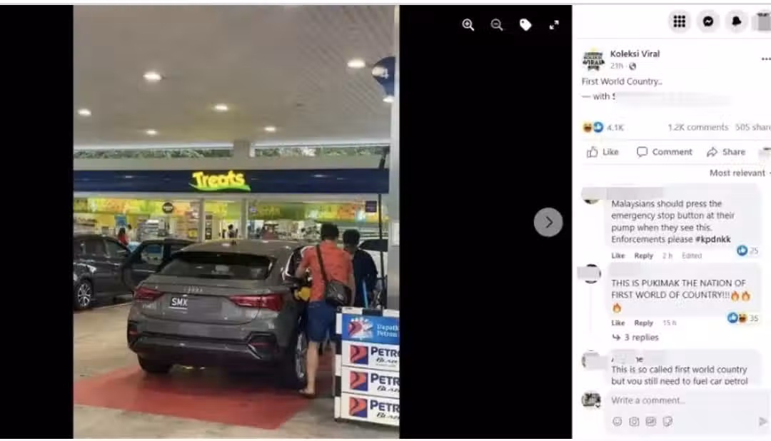 社交媒體專頁Koleksi Viral上傳一張新加坡註冊的奧迪豪華轎車在大馬油站添油的照片,從照片中可見兩名男子在油站添加RON95汽油,而引起熱議。